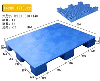 產(chǎn)品型號: HD-1210JP2 產(chǎn)品貨號: T42 產(chǎn)品外尺寸: 1200×1000×140 產(chǎn)品內(nèi)尺寸: 產(chǎn)品結(jié)構(gòu): 九腳平板 產(chǎn)品內(nèi)容量(L): 承重量(T): 動載:1T 靜載:4T 貨架:X 產(chǎn)品認(rèn)可標(biāo)準(zhǔn): 此款塑料托盤適用平地墊倉使用,防潮效果好,且易于清洗;