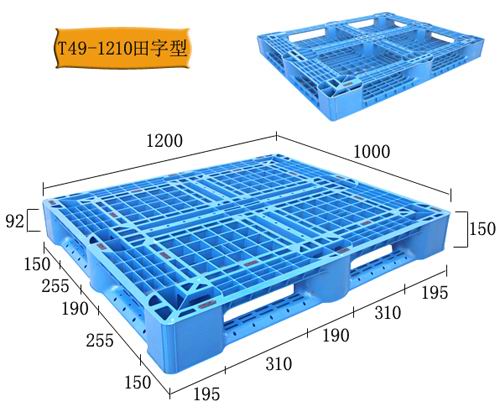 產(chǎn)品型號: HD-1210TW2 產(chǎn)品貨號: T49 產(chǎn)品外尺寸: 1200×1000×150 產(chǎn)品內(nèi)尺寸: 產(chǎn)品結(jié)構(gòu): 單面網(wǎng)格 產(chǎn)品內(nèi)容量(L): 承重量(T): 動載:1T 靜載:4T 貨架:0.6T 該塑料托盤適合平地墊倉、碼垛和上貨架使用;